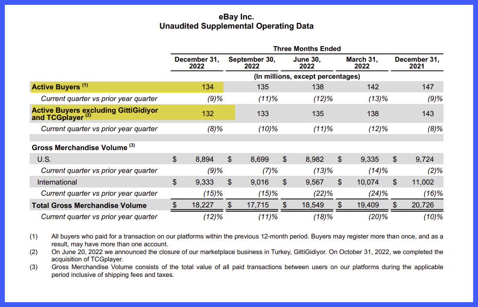 Total active buyers were reported at 134 Million (down 9%) but if you exclude closed Turkish marketplace GittiGidiyor and newly acquired trading card marketplace TCGPlayer, the number is 132M (down 8%).
