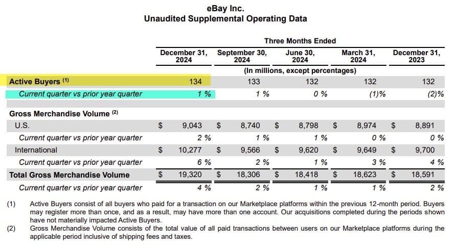 That means eBay managed to eke out only a 1% boost to Active Buyers with significant discounting in Q4, a tactic that previous CEO Devin Wenig was often criticized for in 2018-2019.