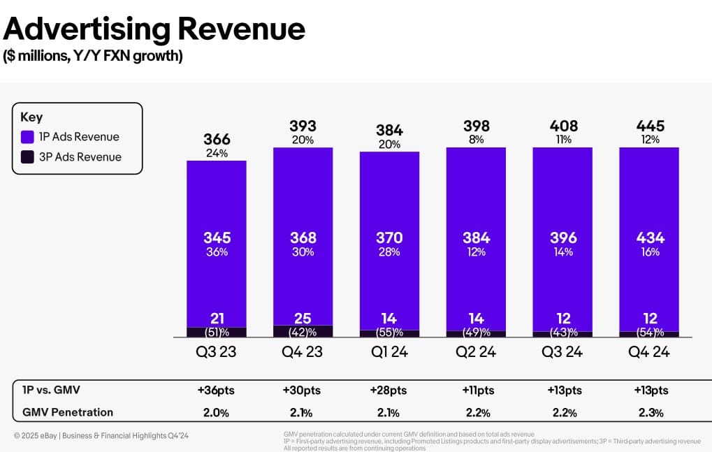 Speaking of advertising, First Party Ad Revenue (all the various Promoted Listings ad types paid for by sellers) grew 16% to $434 Million.