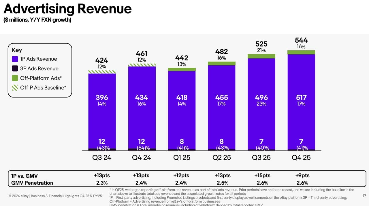- First-party advertising products on the eBay platform delivered $517 million of revenue in the fourth quarter of 2025, up 19% on an as-reported basis and up 17% on an FX-Neutral basis.