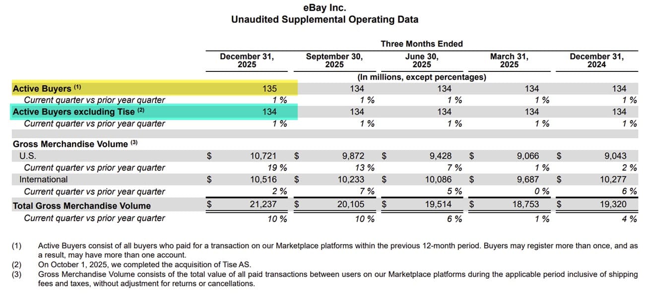 Notably, total Active Buyers were reported at 135 Million, which represents minor year over year growth of 1% - but 1 million of that is attributed to the recent acquisition of Norwegian secondhand marketplace Tise, without which eBay would have still been stuck at 134 Million Active Buyers.