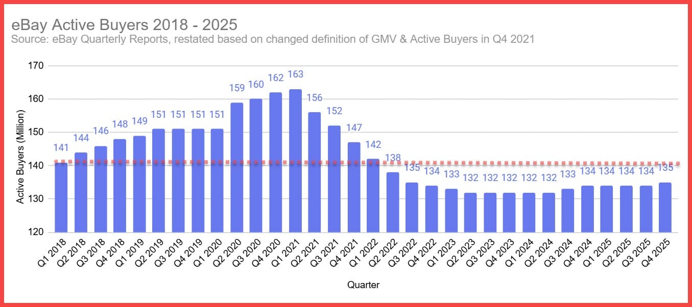 Note: eBay changed the definition of GMV and Active Buyers at the end of 2021 and restated both figures going back to 2018 (chart reflects restated figures per eBay's amended reports.)