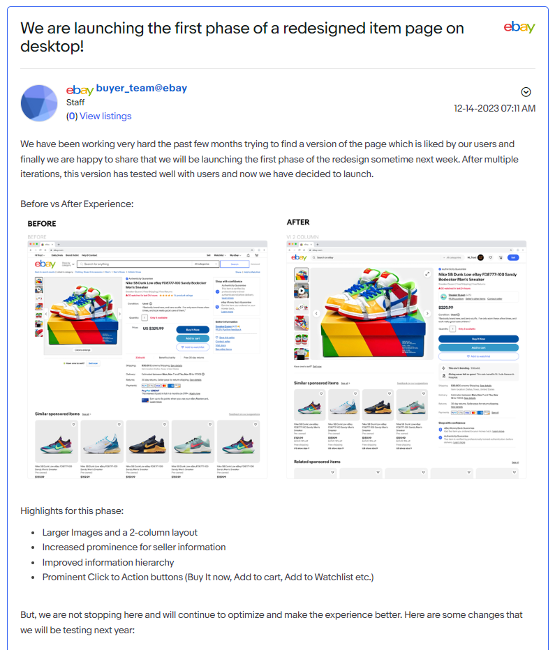 eBay also gave examples of changes they will be testing over the next year, but did not give any specific timeline for when this testing would begin or when the next phase of the design will be finalized.