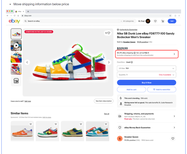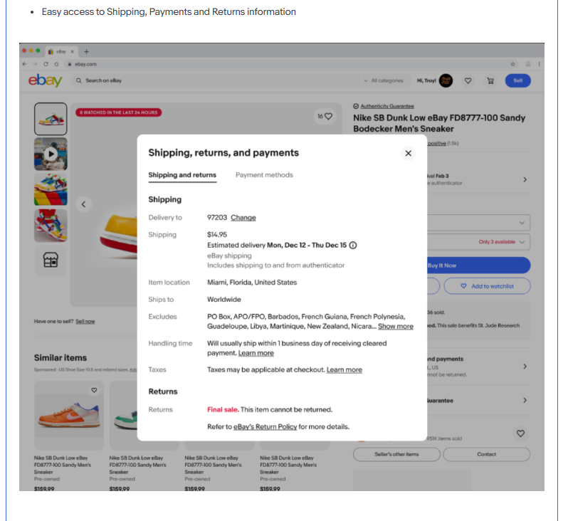 - Prominent Click to Action buttons (Buy it now, Add to cart, Add to watchlist, etc.)