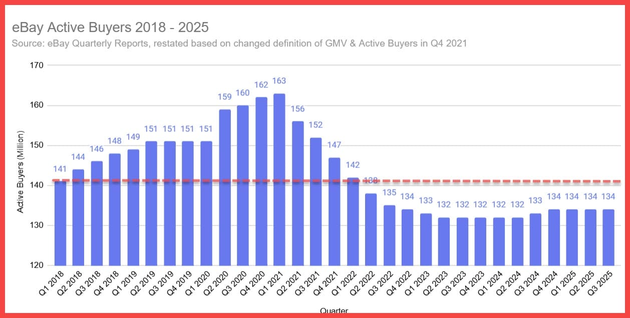 That creates a dangerous spiral pushing total costs to consumers to unsustainable levels that may eventually cause buyers to flee the platform - which eBay can ill afford considering they've now had 14 consecutive quarters with less Active Buyers than in Q1 2018.