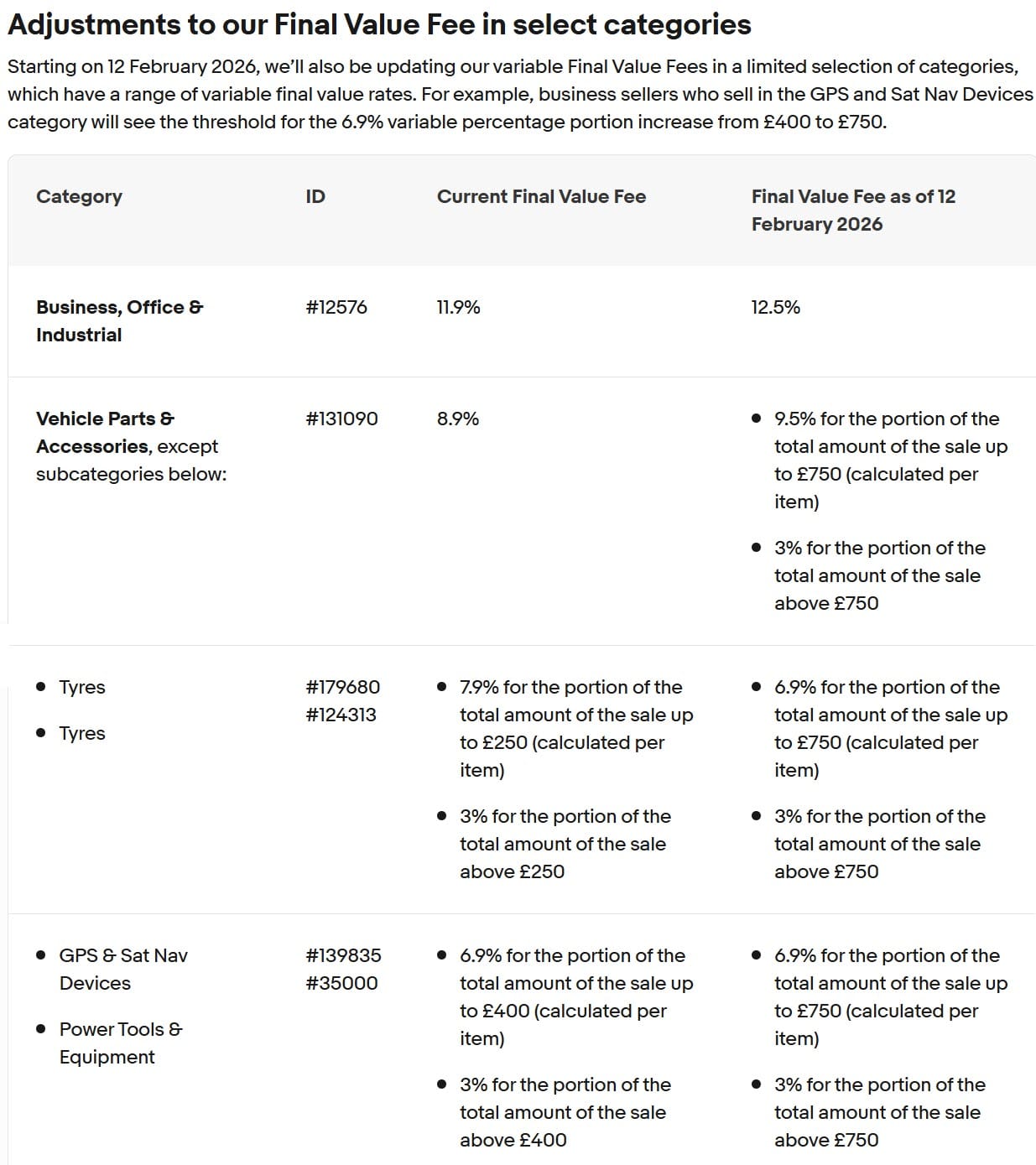 Additionally, UK business sellers will see changes to FVF in Business and Industrial and Vehicle Parts and Accessories categories.