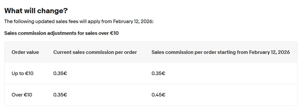 Business sellers in Germany will also see an increase in the fixed per order fee for items over €10, rising from 0.35€ to 0.45€.