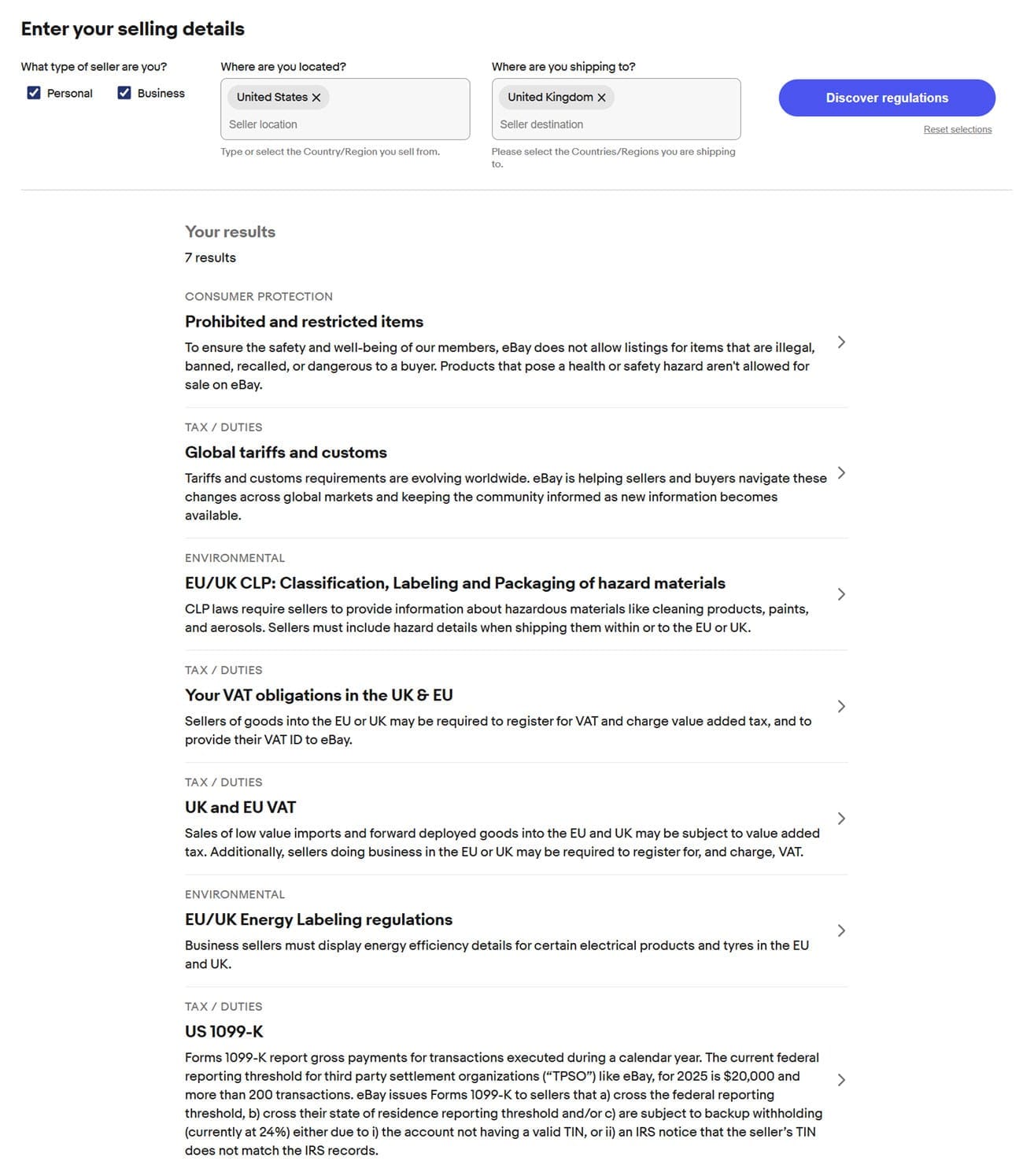 When sellers navigate to the new Regulatory portal page, they can select whether they are using a personal/private or business account, the country where they are located and the country where they are shipping and eBay will populate a list of results for regulatory, legal and compliance issue that may impact them based on those inputs.