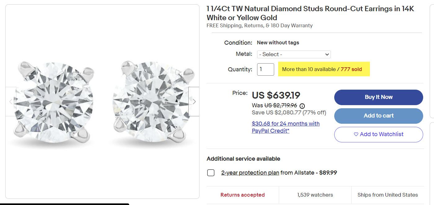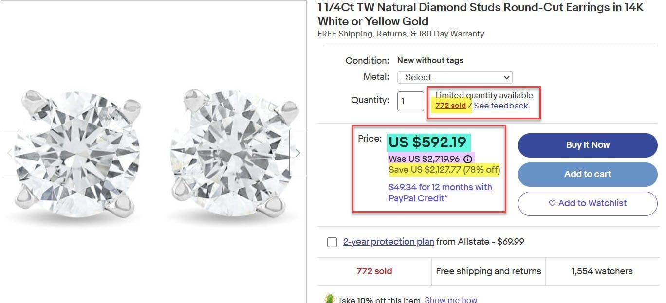 For example, diamond earrings supposedly worth $2,719.96 that were on sale for only $592.19 - a 78% savings!