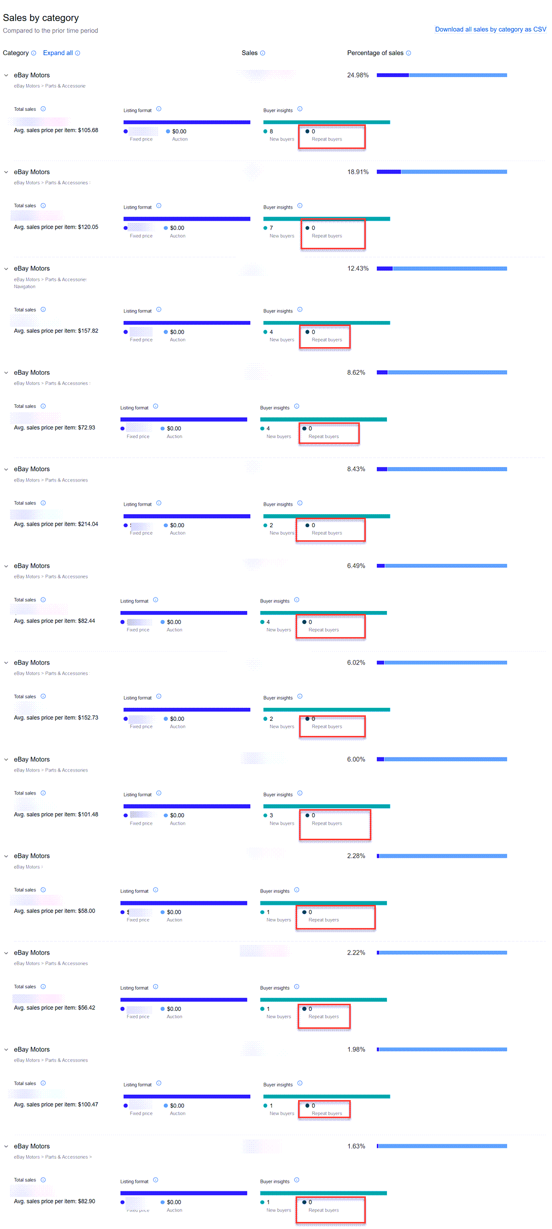 However, there seems to be some discrepancy between the Buyer Insights section and the category breakdown below it. In this example, insights shows 2 repeat buyers, but the categories show 0 both in the visual breakdown and the available downloadable CSV report.