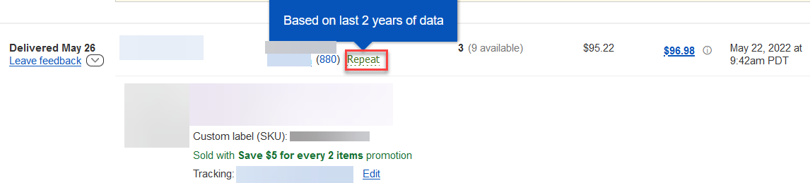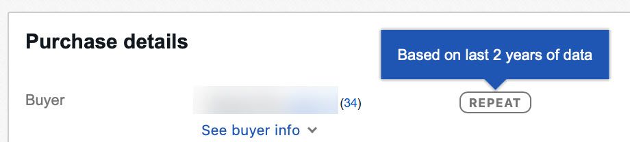 Sellers are also reporting eBay is showing a repeat buyer tag in order details, though this may be a phased rollout that is not available to all sellers just yet.