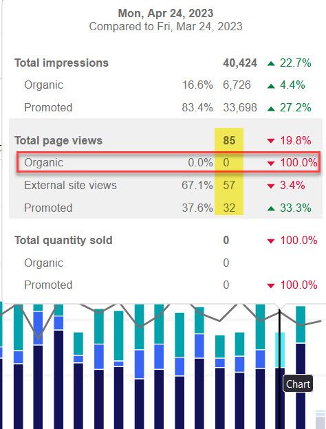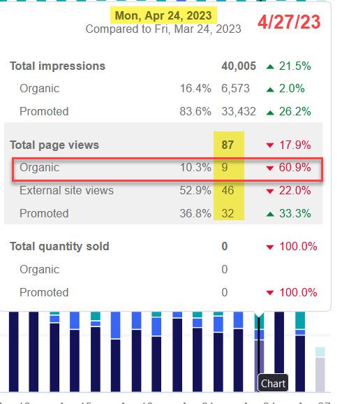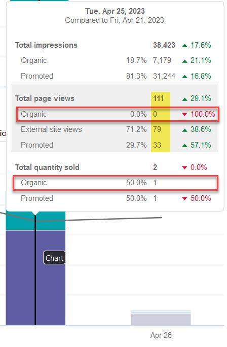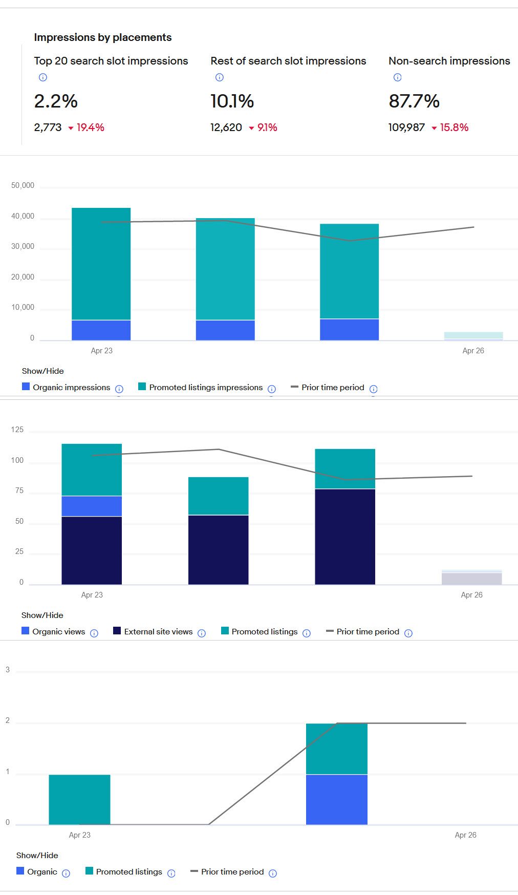 Yesterday, this seller was shown on April 24 there were 0 organic views, 57 external, and 32 promoted.