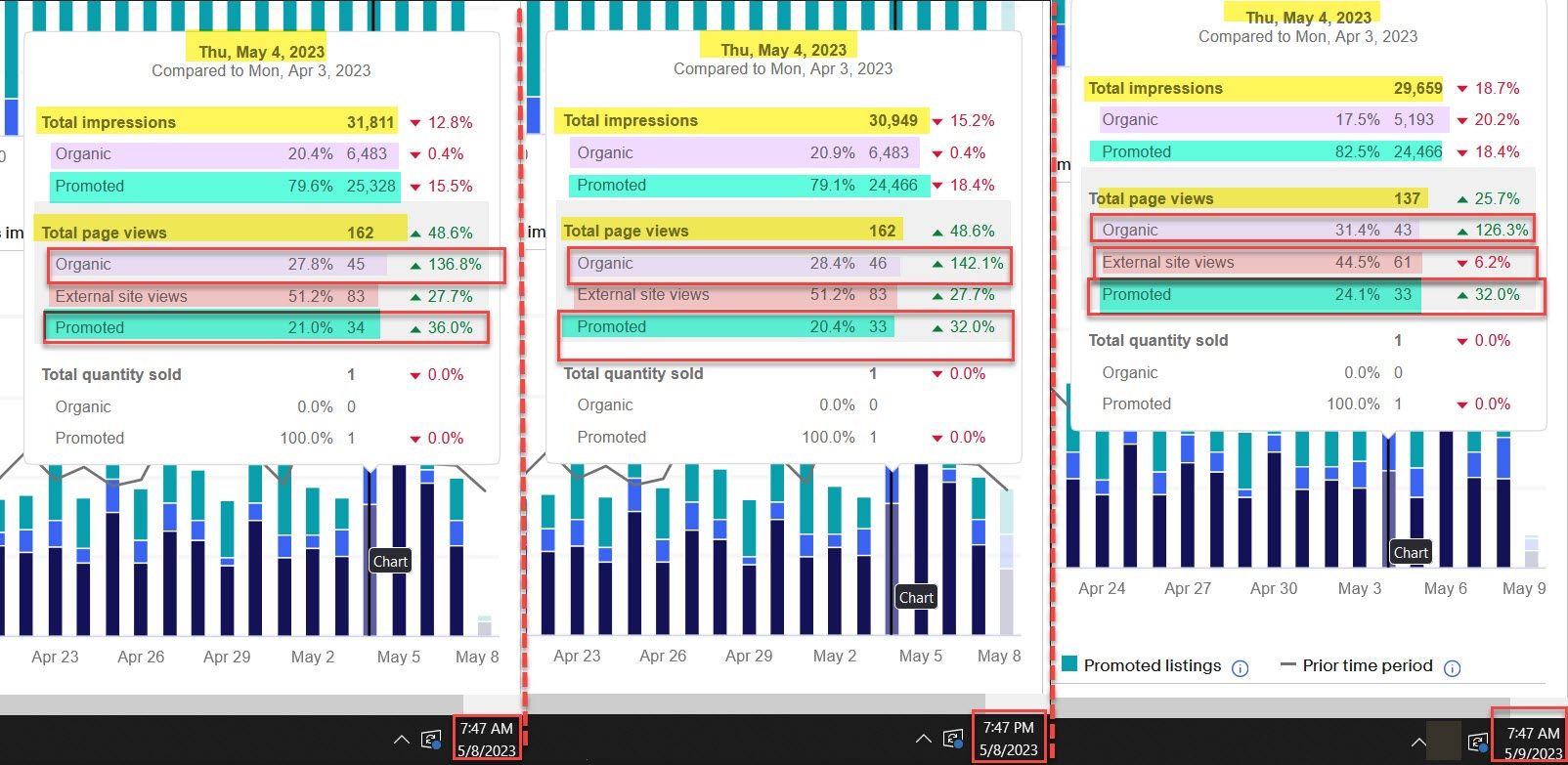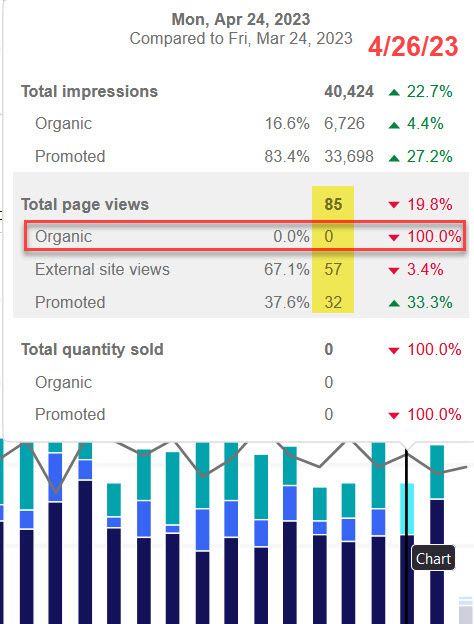 On April 25th, a new issue arose where my organic page views showed 0, which is clearly not accurate. I reached out to customer service, but their response was again unhelpful and similar to my previous experience. These ongoing problems have made me feel unstable and unsure about eBay's reliability. I am now considering moving to another platform, but before making that decision, I want to know if others are facing similar issues.