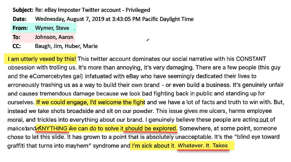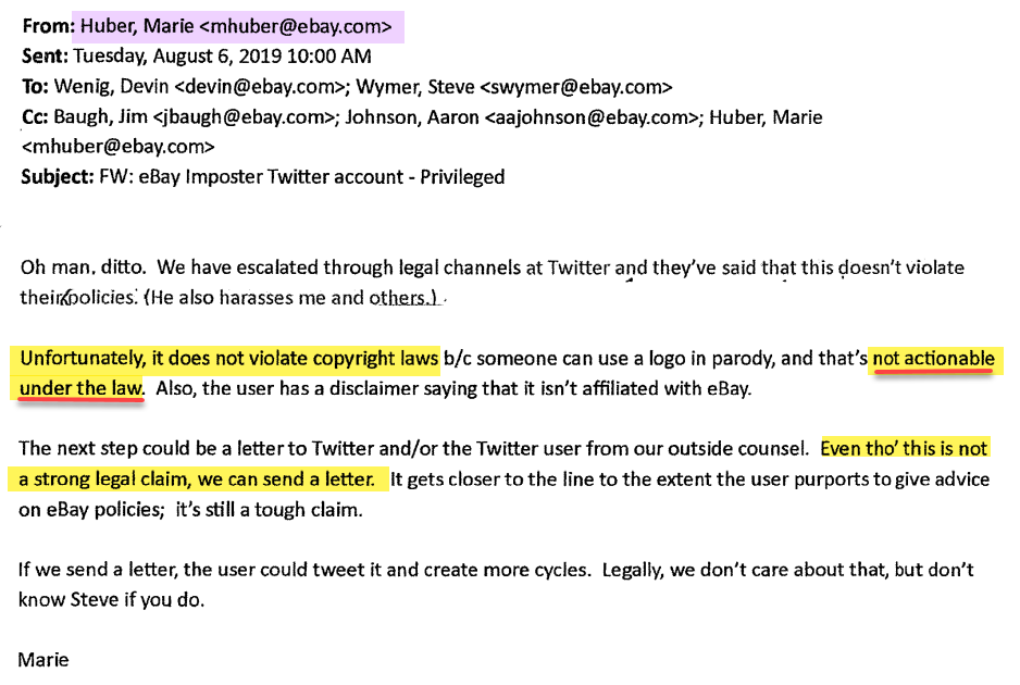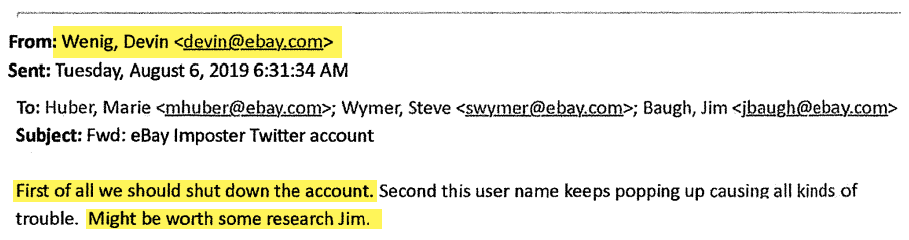 The email chain kicked off with Wenig expressing his desire to see the unsuckEBAY Twitter account shut down - assigning the task to Baugh, with then-Chief Legal Counsel Marie Oh Huber and Wymer copied.