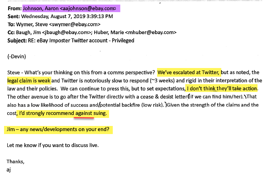 In 2019, Aaron Johnson was VP Litigation, IP Assets and Site Trust. He was on the internal email chain about the Fidomaster/ unsuckEBAY Twitter account that later became central evidence in the cyberstalking case.