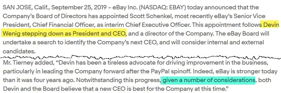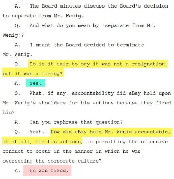 The company was far less transparent about the circumstances of Wenig’s departure. Publicly, eBay described the change in leadership as a resignation, with then-Board chair Thomas Tierney saying Wenig was “stepping down” due to “a number of considerations,” while approving a severance package worth roughly $57 million.