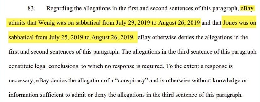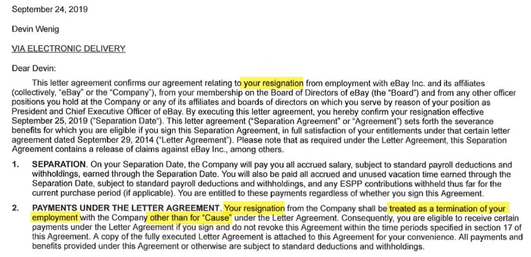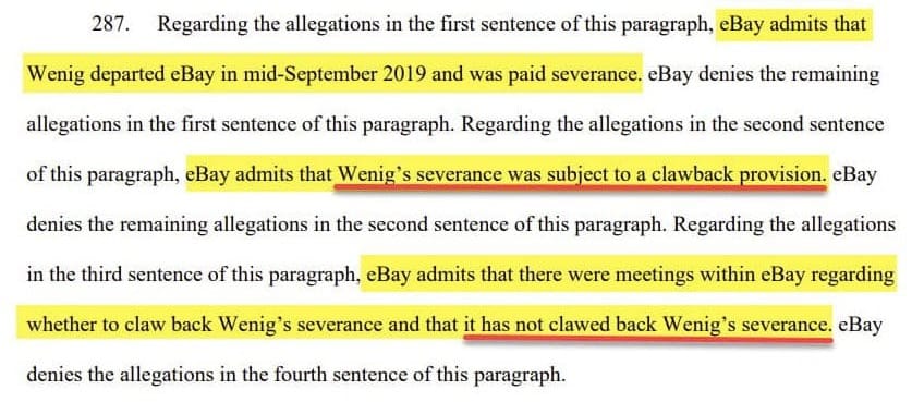 In response to allegations in the civil suit, eBay confirmed that Wenig's severance was subject to this clawback policy and the Board had meetings to discuss whether to act on that provision, but ultimately decided not to proceed.
