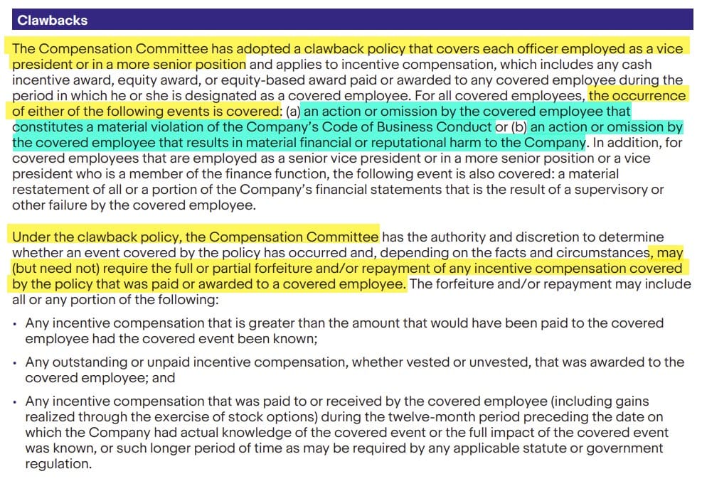 The clawback section now makes clear the committee can and should receive input from other board committees when deciding whether a clawback‑triggering event has occurred - a provision that is almost certainly tied to governance issues directly related to the stalking scandal.