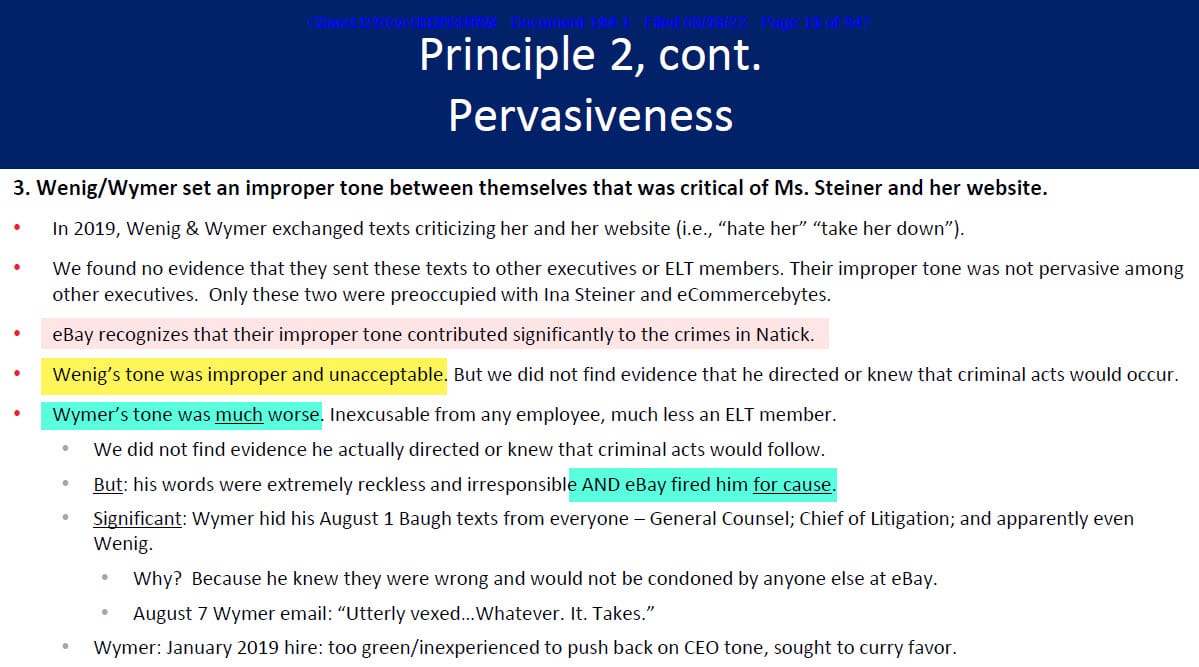 eBay's internal investigation into the matter noted that Wenig and Wymer's tone and communications were "inappropriate" but the company believed their actions were not criminal.
