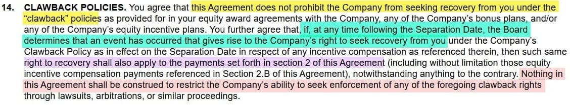 And Wenig's separation letter explicitly stated it did not prohibit eBay from seeking to enforce the clawback provisions, the right to recover would also apply to any payments set forth in the agreement, and nothing in the agreement restricted eBay's ability to seek enforcement of their clawback rights.