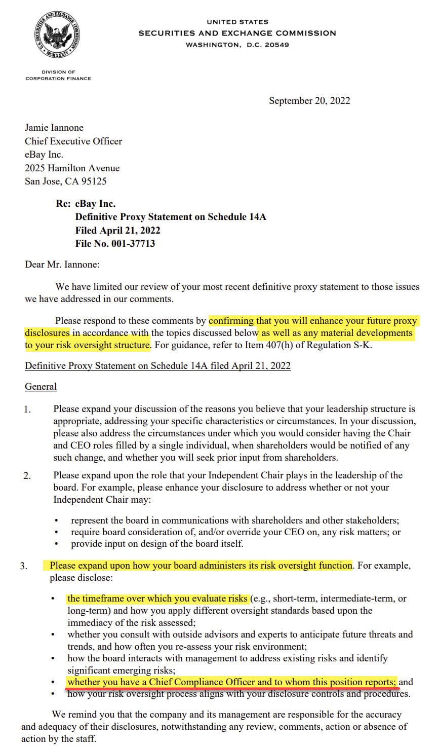 In September 2022, the SEC’s Division of Corporation Finance sent eBay a comment letter on its April 2022 proxy statement. Among other things, the staff asked the company to expand its discussion of board risk oversight and, by way of example, to disclose “whether you have a Chief Compliance Officer and to whom this position reports,” as well as how risk oversight aligns with disclosure controls and procedures.