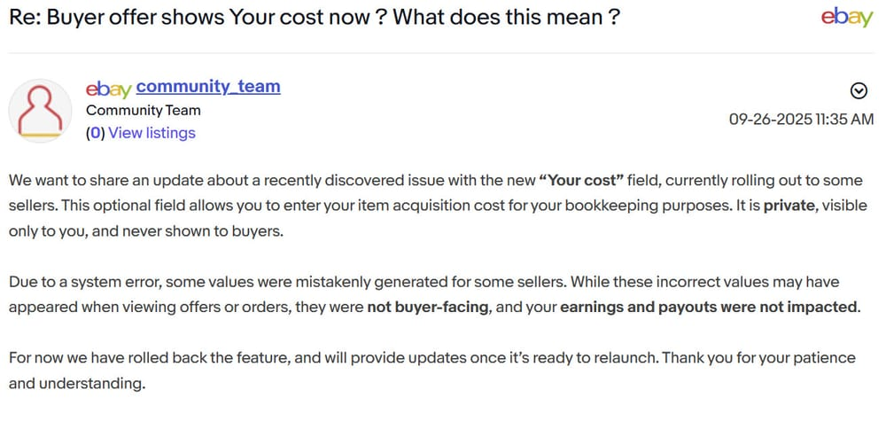 And this actually isn't the first time eBay has attempted to launch Cost of Goods Sold - but the previous attempt in August 2024 was quickly withdrawn after an embarrassing premature launch failure.