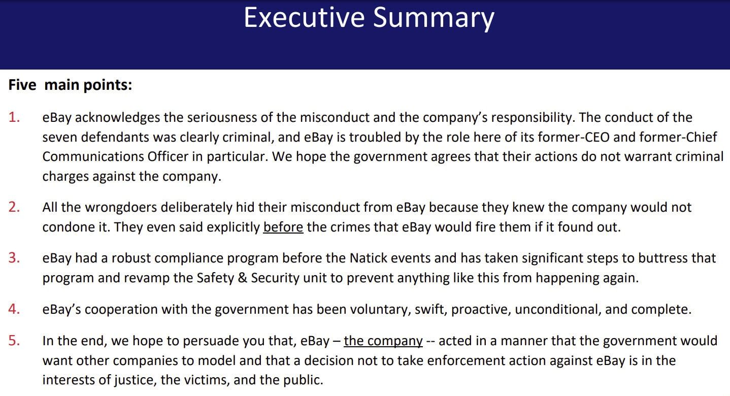 eBay recently entered into a deferred prosecution agreement with the DOJ accepting criminal liability for the felonious acts of their employees in the cyberstalking scandal, which includes a $3 Million fine and 3 years of enhanced compliance monitoring.