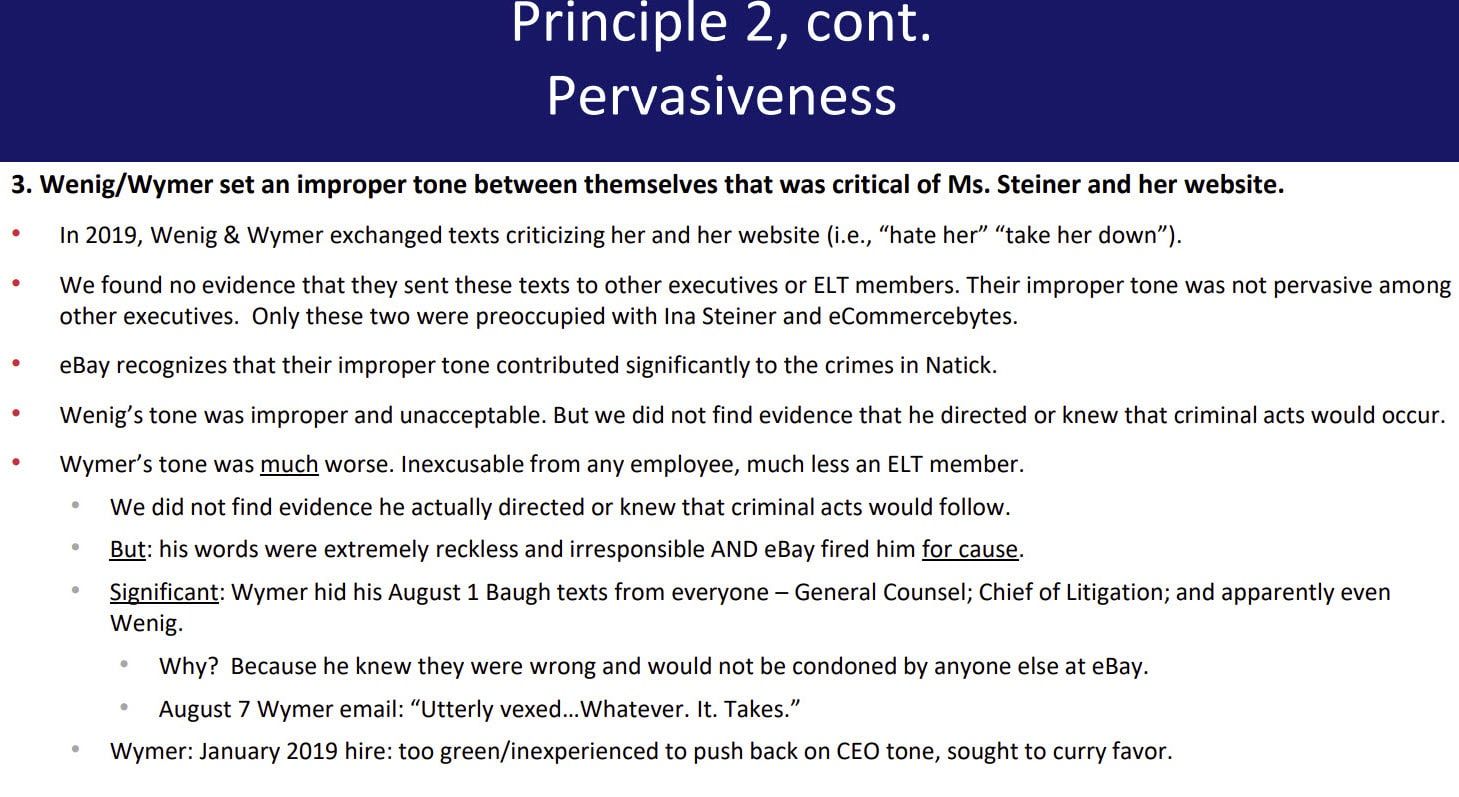 A PowerPoint presentation made by eBay to the U.S. Department of Justice, in which the company said it was troubled by the roles Wenig and Wymer played, described Wymer's conduct as "inexcusable" and recognized Wenig and Wymer had "contributed significantly to the crimes."
