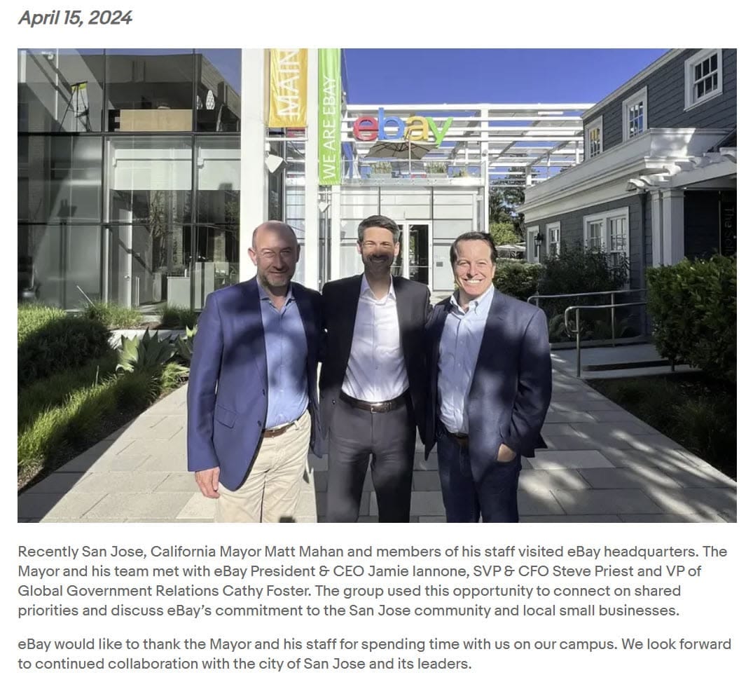 San Jose Mayor Matt Mahan recently stopped by eBay to meet with CEO Jamie Iannone and CFO Steve Priest to discuss "shared priorities", eBay's commitment to the San Jose community and continued collaboration with city leaders.