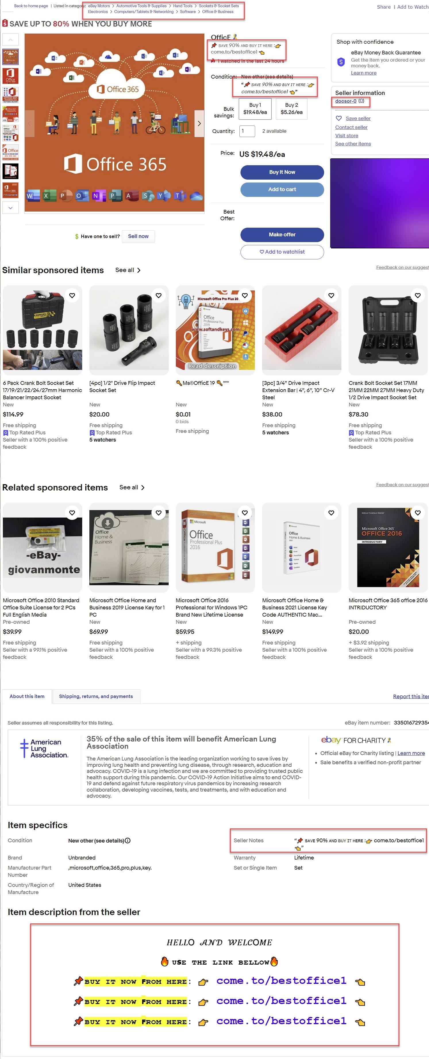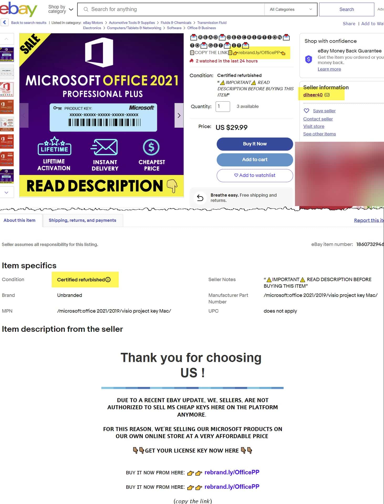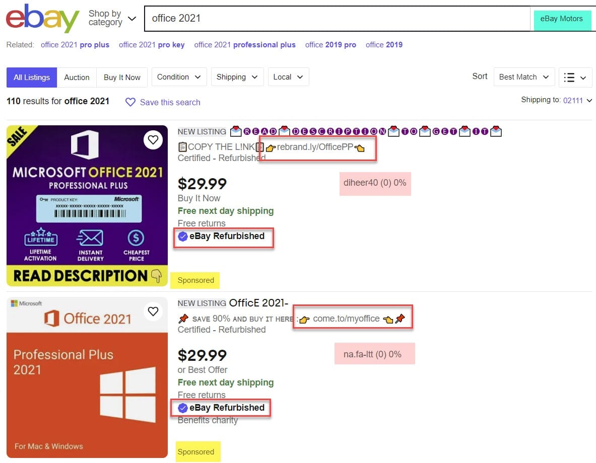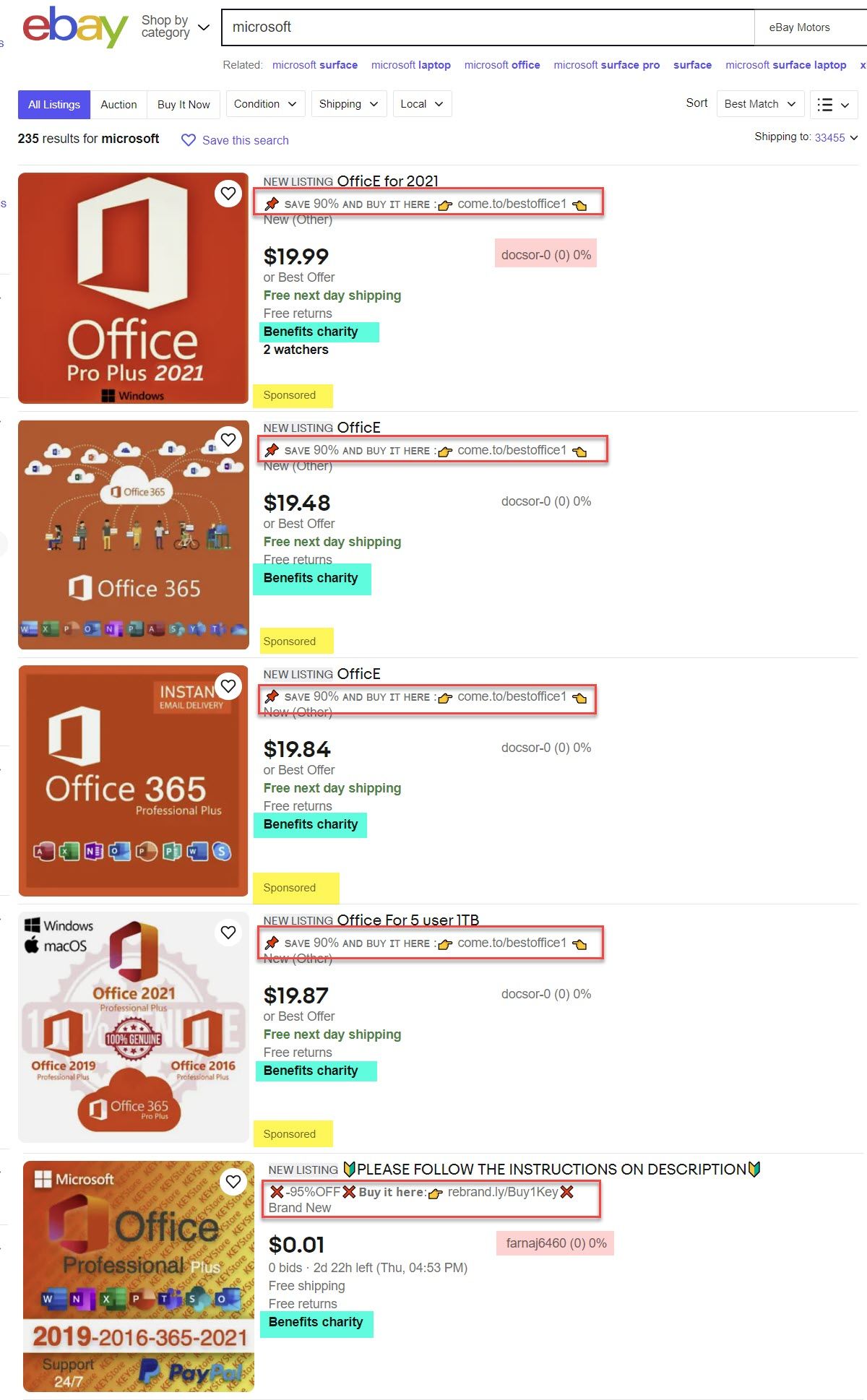 I have already clicked on such a link on Ebay once and lost money. Seeing this, I sent the report to the listing. One of the listings was removed, but hundreds of new ones have appeared. And even now there are dozens of them every hour. Just search for "Windows 10" or "Microsoft Office" and you'll see dozens of listings with links in the results. Ebay in these categories is littered with junk listings.