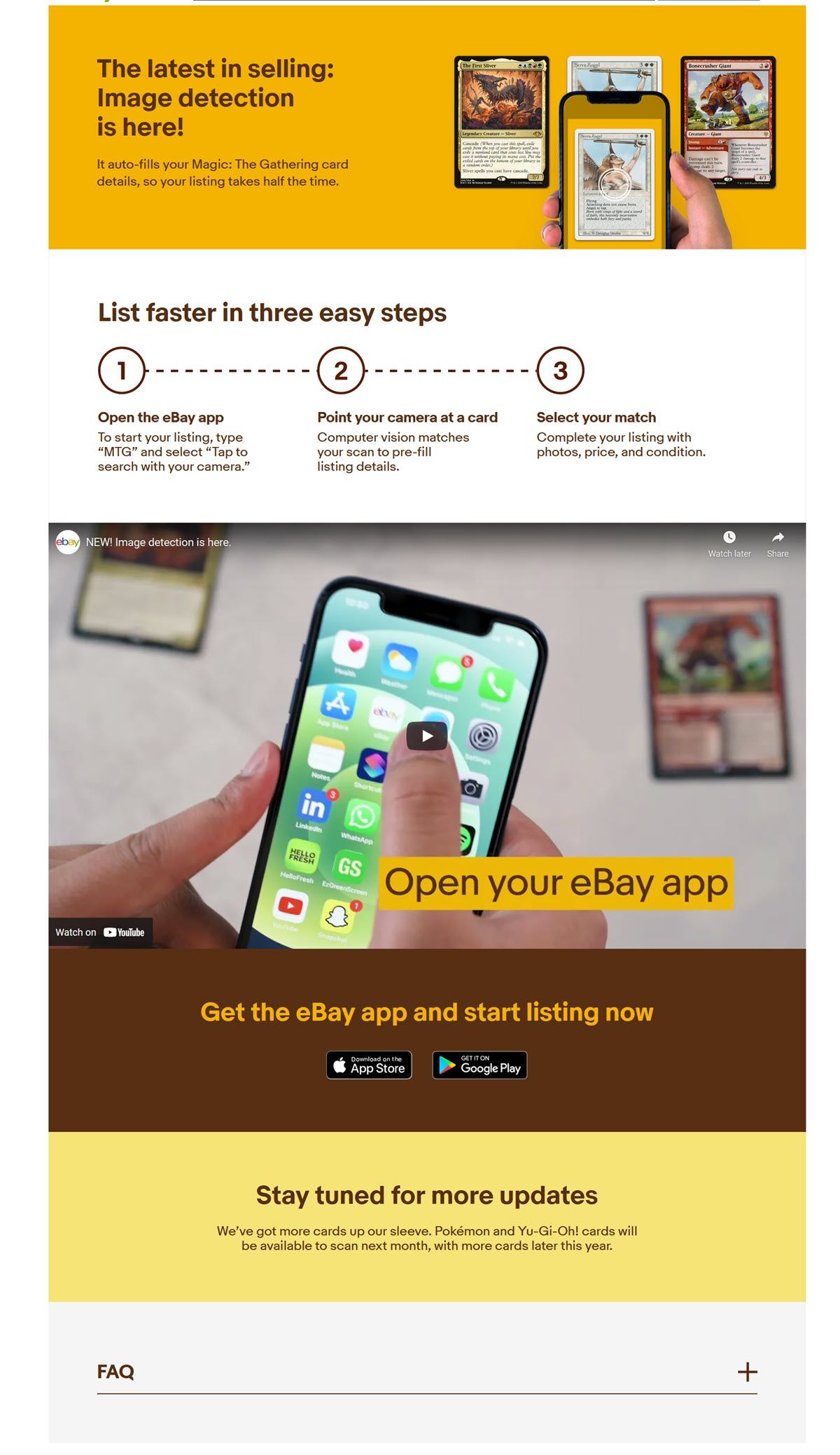 UPDATE 5-25-21 - eBay officially announces support for Pokémon and Yu-Gi-Oh! cards as well as Magic the Gathering with the Scan To List tool.