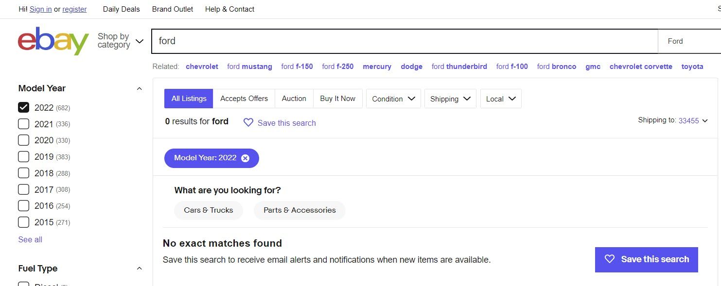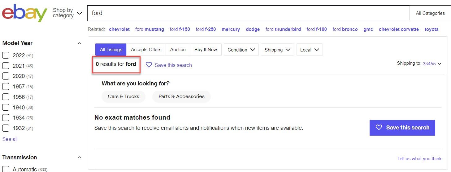 For example, a sitewide search for the word Ford brings up 0 results, even though the filters on the side show there should be results.