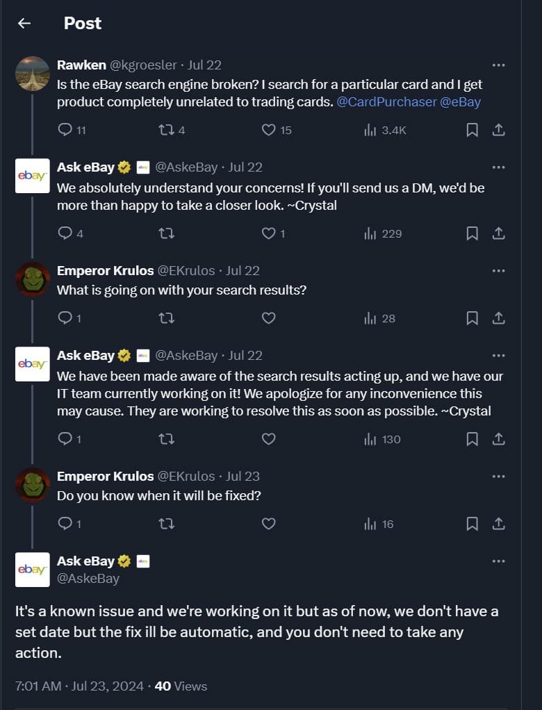 The issue may be affecting other categories as well, but reports in the eBay community show searches for sports trading cards are particularly heavily impacted.