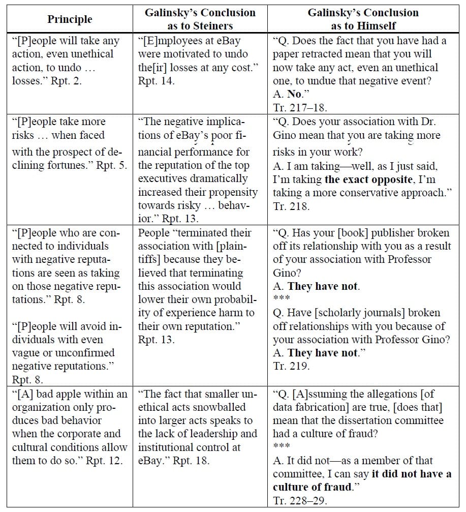 eBay said "despite opining that 'a bad apple within an organization only produces bad behavior when the corporate and cultural conditions allow them to do so,' Dr. Galinsky denied that his collaboration with Gino on papers later retracted for research fraud means that his research team had a culture of fraud", providing a chart to illustrate alleged inconsistencies with how Galinsky applied social psychology principles in each circumstance.