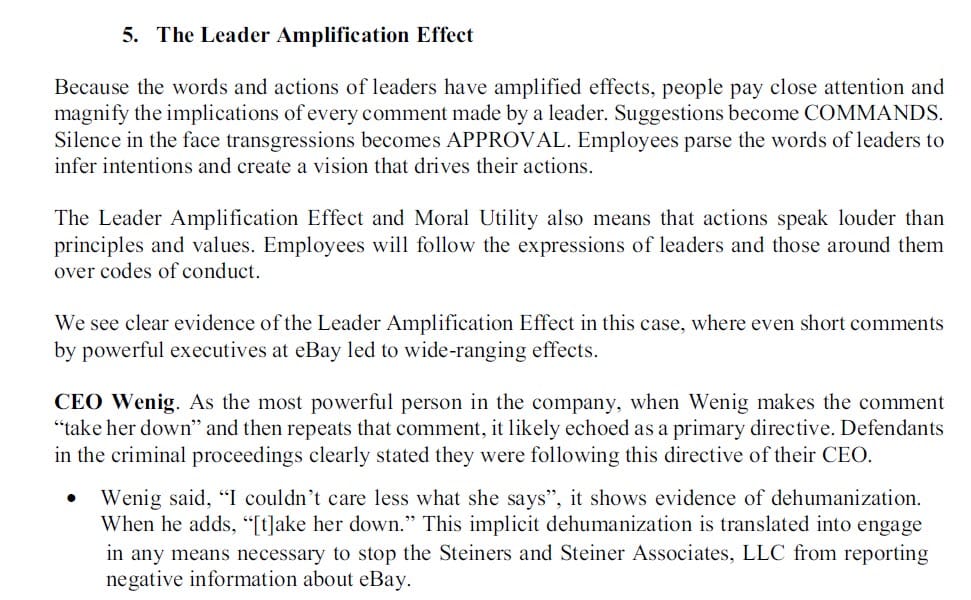 It's inexplicable how anyone could review those emails as shown in documents filed in this case (let alone do even a cursory review of eBay's leadership structure and existing compliance efforts at the time of these events) and not catch something as simple as the fact the Chief Legal Officer was a woman - a point eBay seized on during their deposition of Dr. Galinsky in an effort to undermine his suitability as an expert witness.