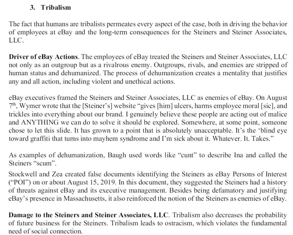 Excerpts from Galinsky's report show the kinds of general social psychological conclusions eBay refers to, for example, this section about how tribalism drove the behavior of eBay employees and possible long-term consequences for the Steiners.