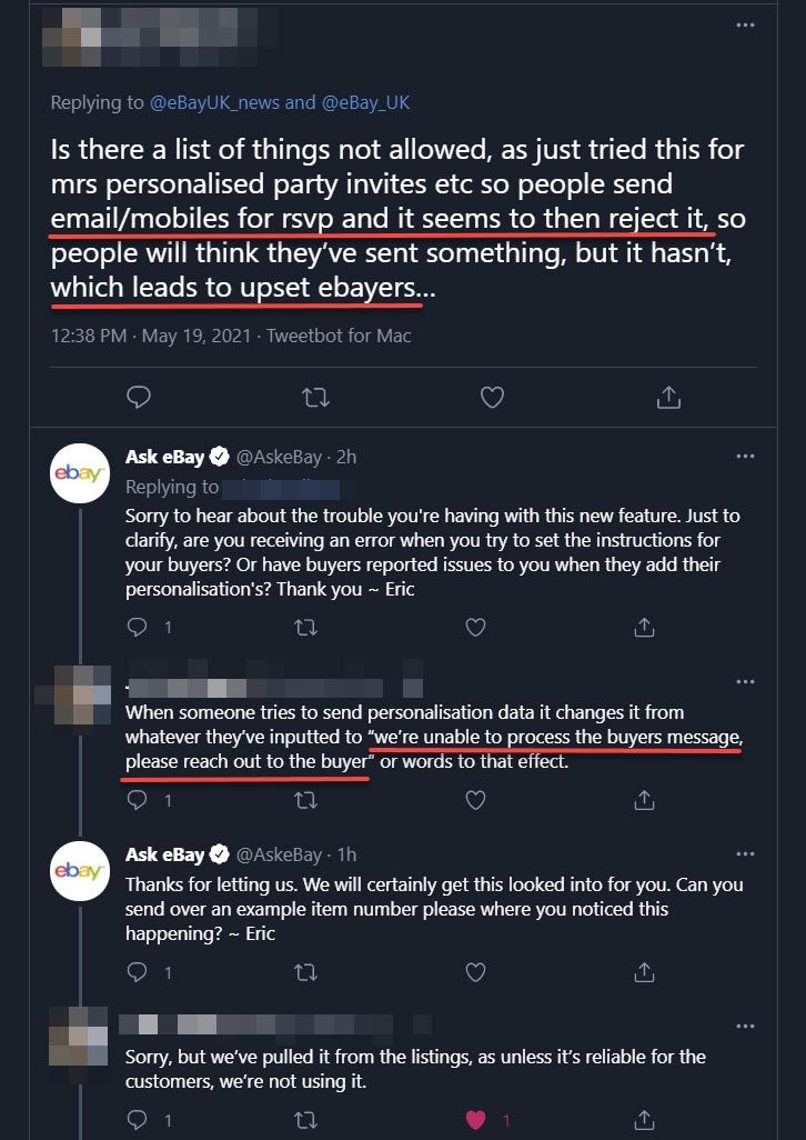 Building this functionality on top of the eBay messaging system begs the question - will eBay provide protection for sellers if a similar technical snafu happens again and they do not receive the automated personalization messages?