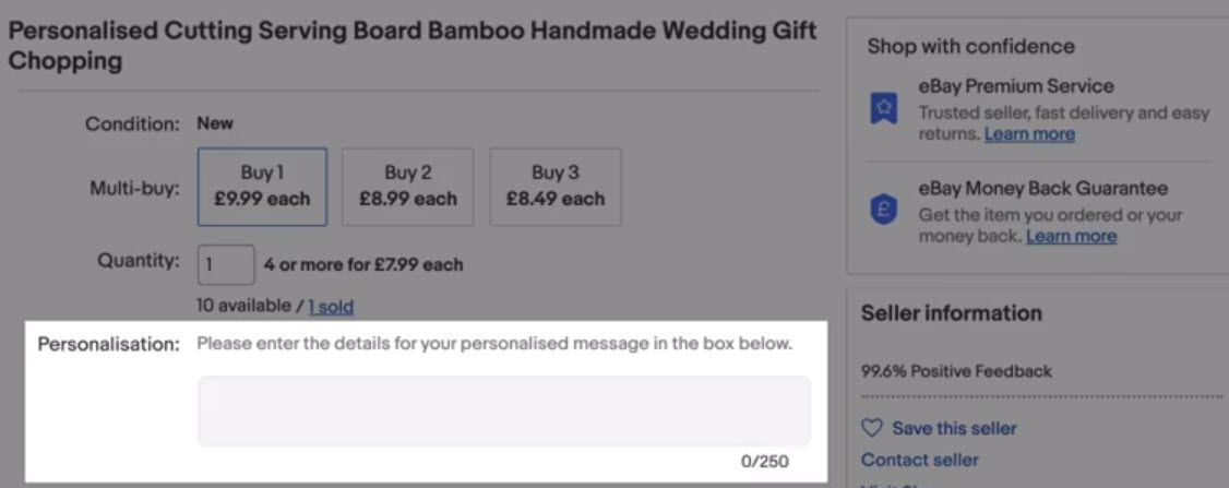eBay has tapped into their Item Specifics function to power this feature. The seller can enable the personalization item specific and enter a custom message to be displayed to the buyer.
