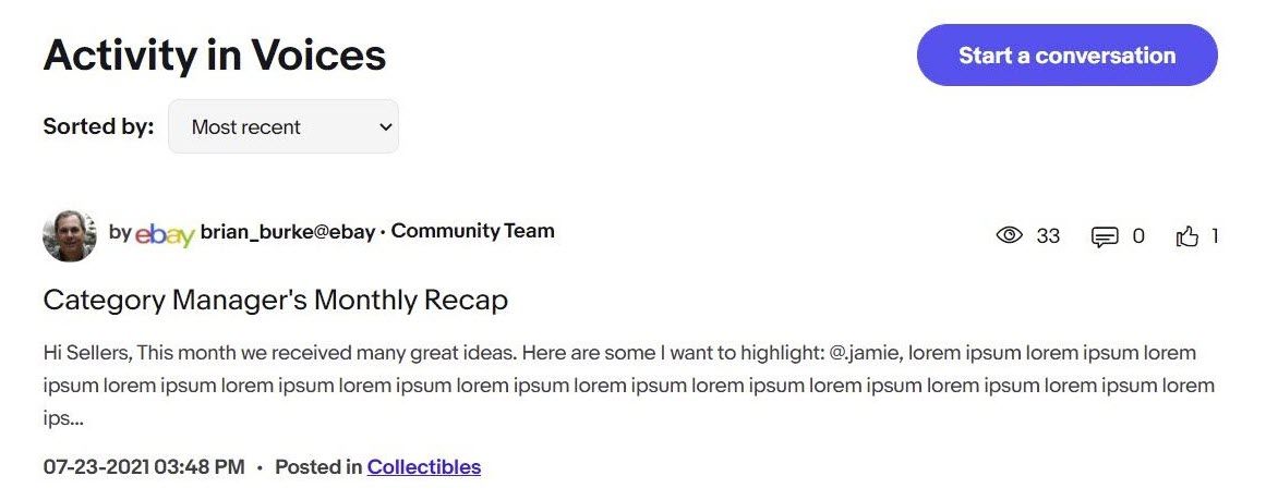 There were also concerns expressed about how eBay was choosing which sellers would be allowed to participate. Only "approved" Voices Sellers were allowed to create posts in this area of the community but there was no transparency as to the selection process or criteria. I attempted to get clarification about the process, but never received a satisfactory response.