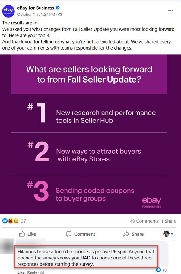 Even publicly available eBay survey's are often presented with less than transparent results, like this eBay for Business Facebook post after a recent survey about the Fall 2021 Seller Update.