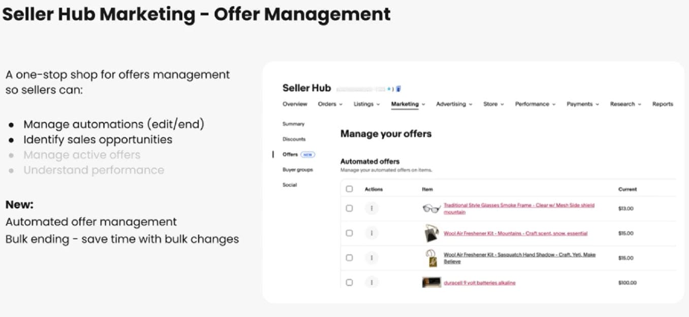 It's called the Offers page and this page will become your one-stop shop for offer management, so you can manage your offers, you can dedit and end offers individually, or if you have many listings, if you're a large seller, we now allow you to end automation in bulk. This will be a huge timesave and improve efficiency.