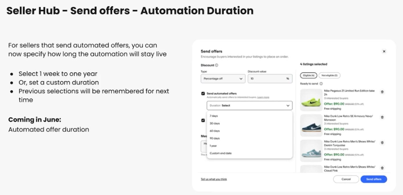 And finally, Swanson says Automated Offer Duration will be rolling out in June as well, allowing sellers to specify how long they want automation to stay live.