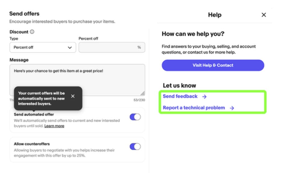 First- [Bug or intended?] eBay is forcing the default to "on" for automated offers and counter offers. As things stand today, sellers have to manually toggle off those settings every single time they send an offer if they don't want those settings active.