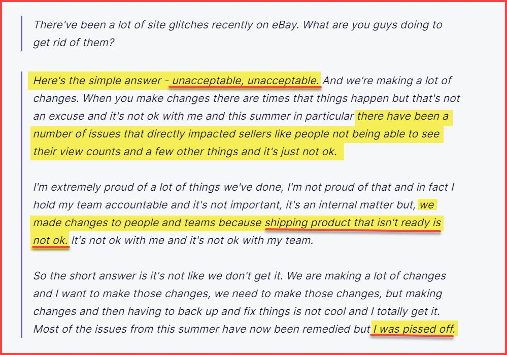 Ex-CEO Devin Wenig faced intense scrutiny from sellers and investors alike when it came to ongoing technical issues plaguing the platform, infamously saying at eBay Open 2018 that technical glitches are unacceptable and really pissed him off.