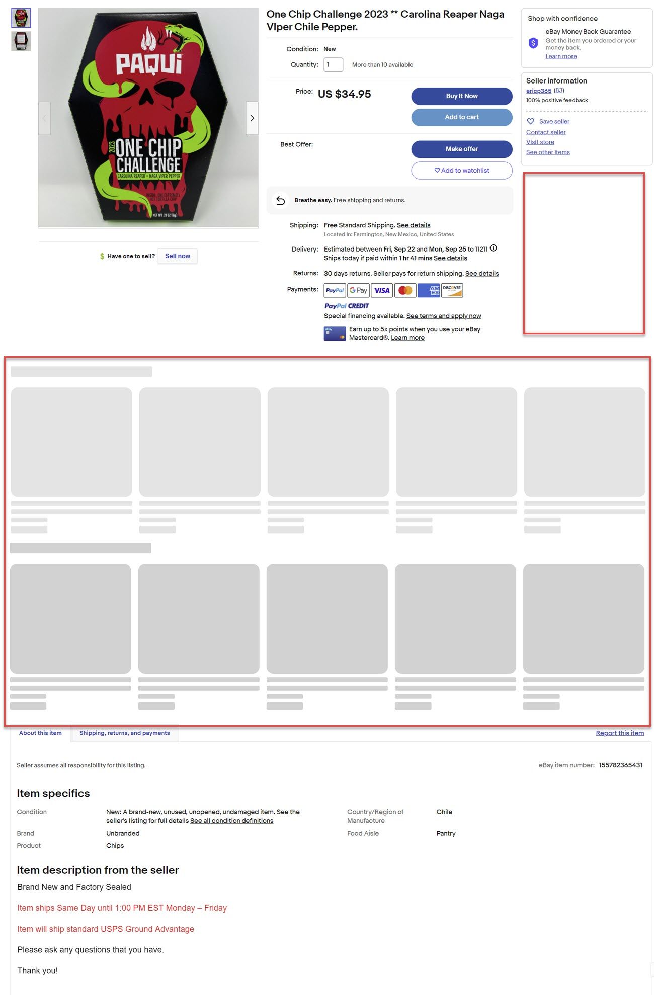 While some sellers may be somewhat happy that competing ads are not showing above their descriptions when this happens, the blank boxes still push the description down out of view and of course buyers who encounter this strange experience may be more likely to exit the page without purchasing if they believe something is wrong with the site or they may encounter further technical issues if they were to try to check out.