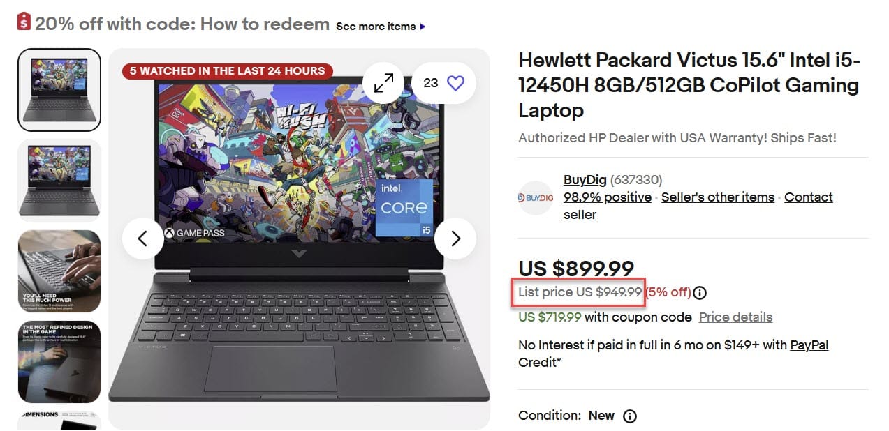 This Hewlett Packard Victus Gaming Laptop is listed at a current price of $899.99, supposedly 5% off the list price of $949.99, with the extra 20% taking it to $719.99.