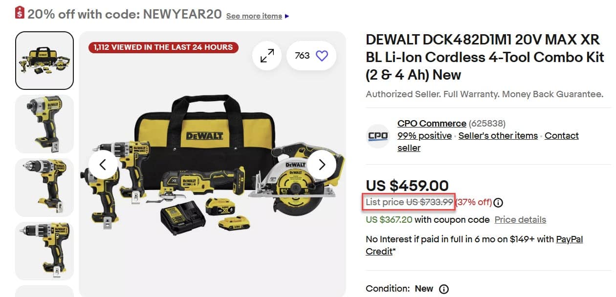 And this DEWALT Cordless 4-Tool Combo Kit is at $459, supposedly 37% off list price of $733.99 plus the extra 20% brings it down to $367.20.