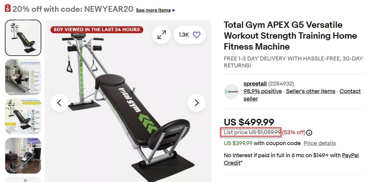 For example, this Total Gym APEX G5 shows a current price of $499.99, supposedly 53% off of the list price of $1,059.99 - plus the extra 20% off coupon brings it down to $399.99.