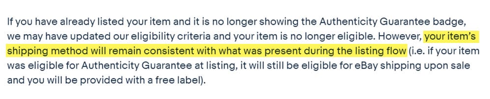eBay has updated the FAQ for sellers to clarify that if the eligibility changes on the listing before sale, the $14.95 FedEx shipping will still apply and a label will be provided the ship to the buyer instead of to the authenticator.