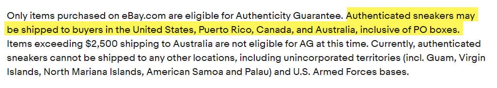 Authenticated sneakers can now ship to PO Boxes and Puerto Rico, but Guam, Virgin Islands, North Mariana Islands, American Samoa and Palau) and U.S. Armed Forces bases are still excluded.